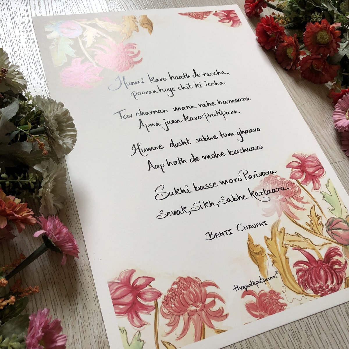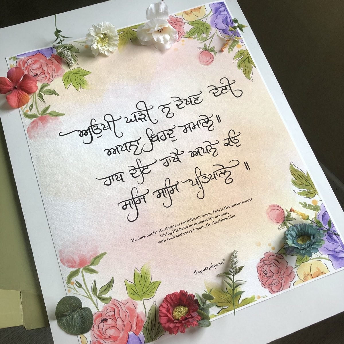 Ans-Yes. There is an option to add a quote, poem or Gurbani saying to the artwork. Simply send the wordings to us through the inquiry form and it will be added to your artwork in the Artist’s hand writing.