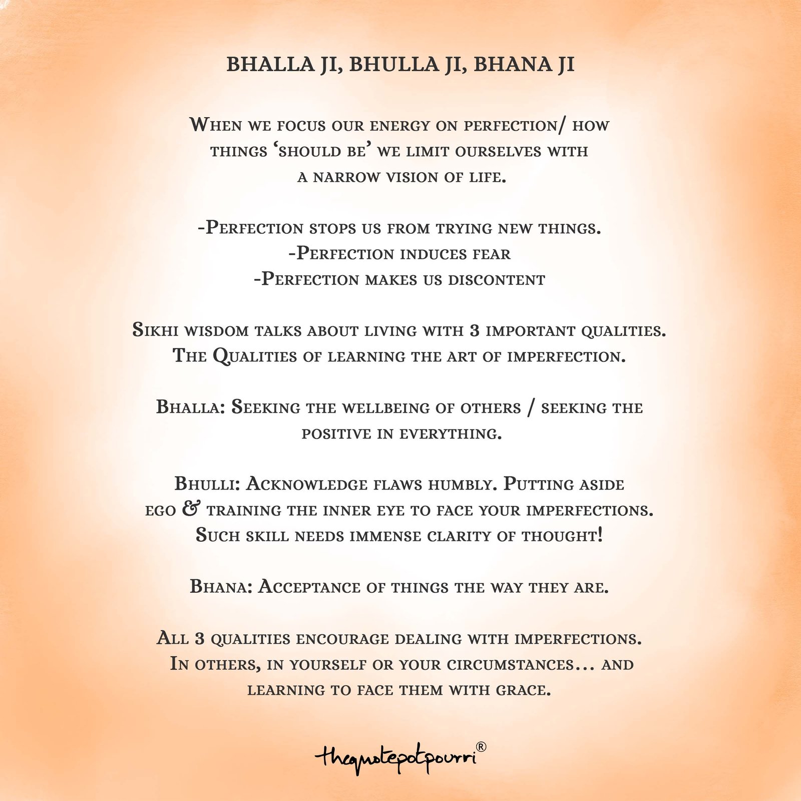 Sikhi wisdom talks about living with 3 important qualities. The Qualities of learning the art of imperfection.