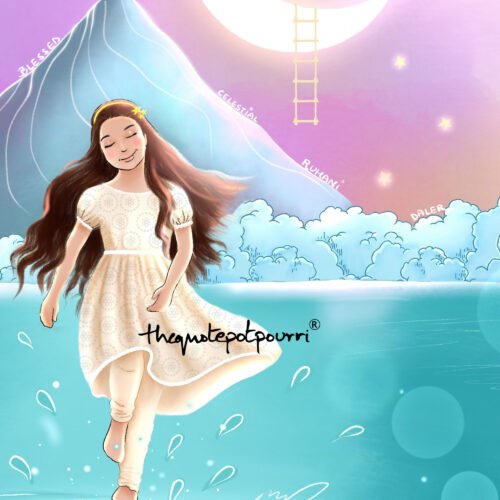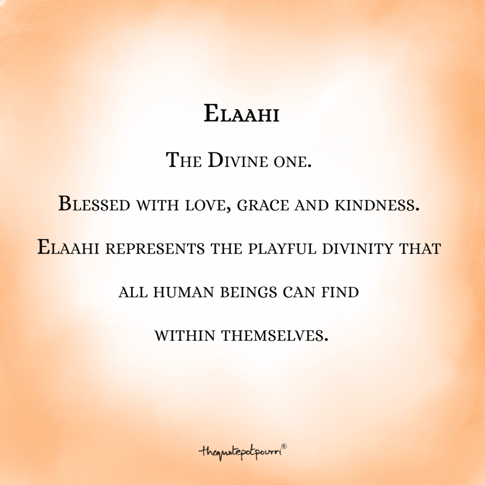 Elaahi; The Divine one. Blessed with love, grace and kindness. Elaahi represents the playful divinity that all human beings can find within themselves.