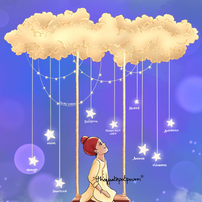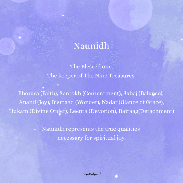 Bhorasa (Faith), Santokh (Contentment), Sahaj (Balance), Anand (Joy), Bismaad (Wonder), Nadar (Glance of Grace), Hukam (Divine Order), Leenta (Devotion), Bairaag (Detachment)