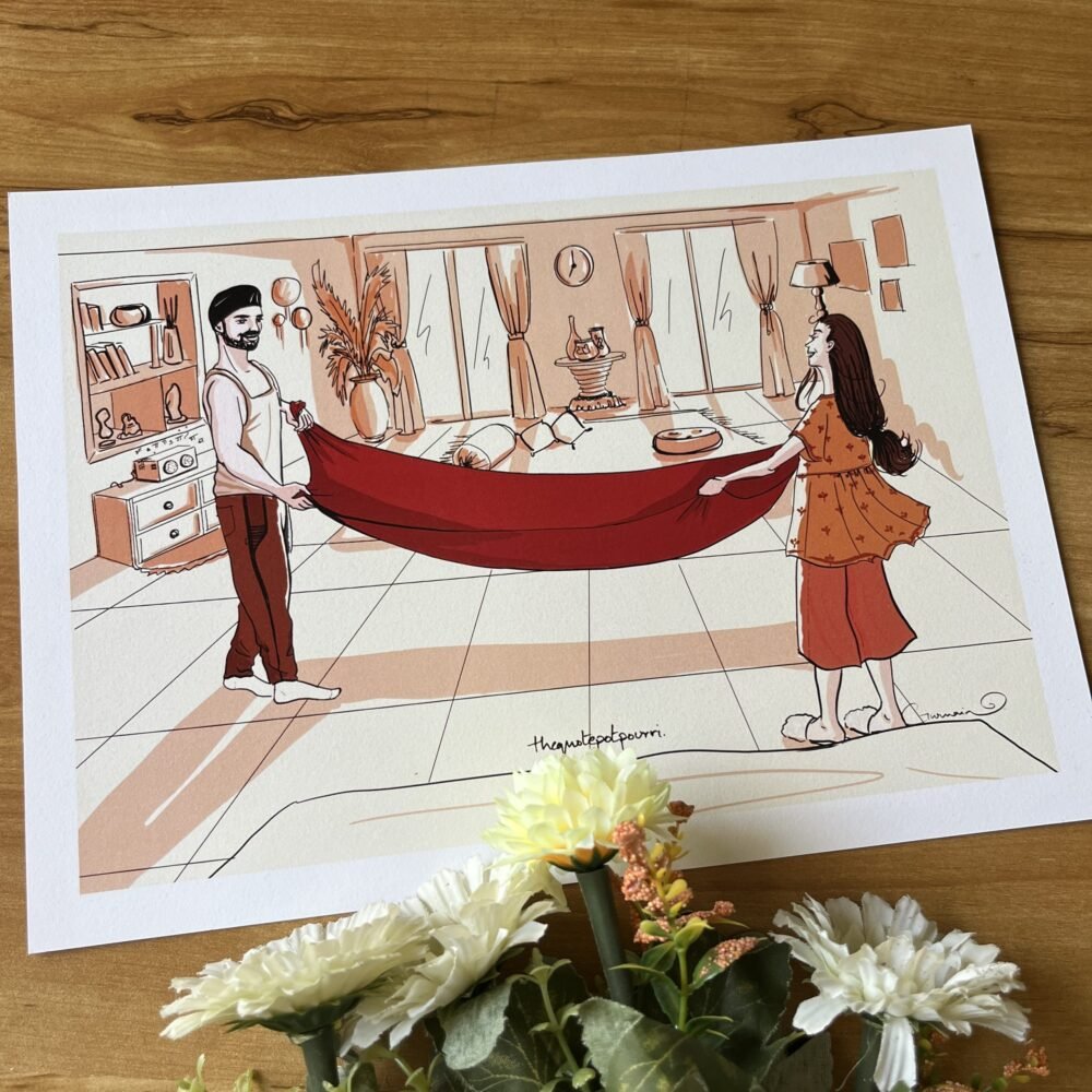 Someone once said to me that there is something beautifully poetic about helping your man do his ‘pohni’ every time he gets ready. And that was how this sketch was born! Here’s to lazy Sunday mornings, lots of sunshine, Punjabi folk music in the background and pohni time conversations.❤️